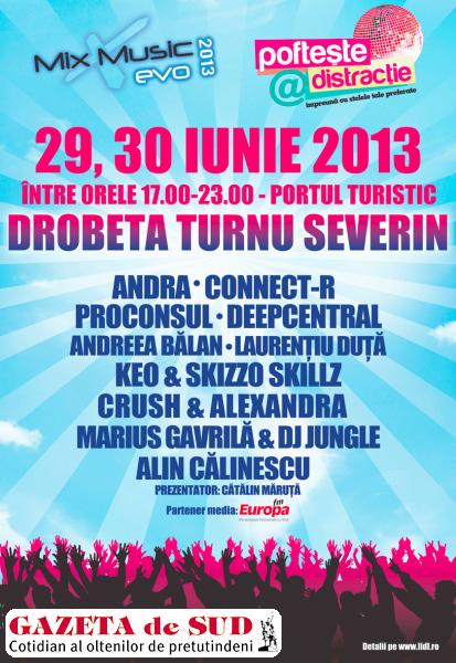 Concertele din cadrul turneului Mix Music Evo şi campania „Pofteşte şi Găteşte” vor poposi la sfârşitul acestei săptămâni şi la Drobeta Turnu Severin. Manifestarea se va desfăşura sâmbătă, 29 iunie 2013 şi duminică, 30 iunie 2013, în Portul Turistic din municipiu. În cadrul evenimentului vor susţine recitaluri cunoscuţii artişti români Keo, Skizzo Skillz, Andreea Bălan, Proconsul, Andra, DeepCentral, Connect-R, Crush & Alexandra, Laurenţiu Duţă, Marius Gavrilă & DJ Jungle şi Alin Călinescu, iar gazda evenimentului va fi Cătălin Măruţă.