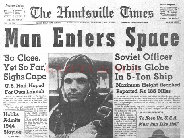 Pe 12 aprilie 1961, visul lui Yuri Gagarin de a vedea Pământul din spaţiu se împlinea: urcat la bordul rachetei Vostok 1, Yuri a ţinut un scurt discurs în al cărui final a spus: „Mă bucur că voi putea vedea lumea faţă în faţă!”. După numai 14 minute de la lansare, nava – încărcată doar cu provizii de apă şi oxigen – părăsea atmosfera Terrei, intrând în spaţiul cosmic.
