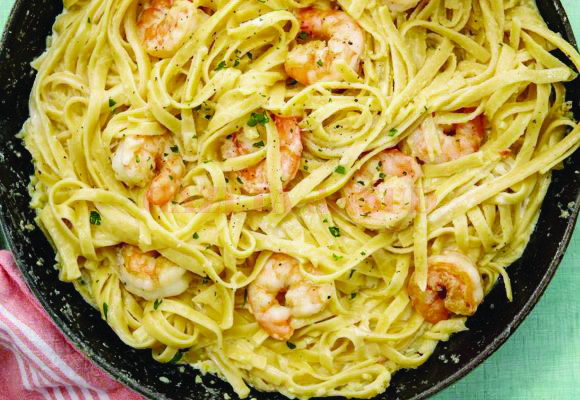 În tigaie, pui cealaltă lingură de unt și usturoi. Călești circa un minut. Bați gălbenușul de ou cu smântâna și laptele și răstorni amestecul peste usturoiul călit în unt. Lași să fiarbă puțin și adaugi parmezanul, pastele fierte și creveții, amestecând ca să se combine. Asezonezi cu sare și piper. Ornezi cu pătrunjel.