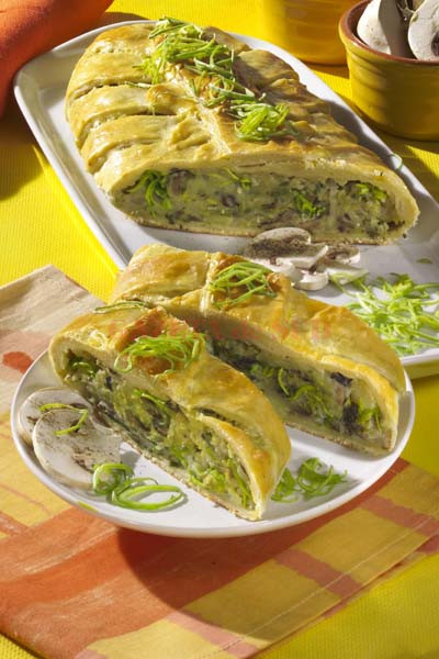 Mod de preparare: Aluatul de plăcintă se desface şi se lasă la decongelat, iar cuptorul se încălzeşte. Prazul se taie rondele şi se pune într-o oală mică de 2-3 l. Se adaugă laptele şi uleiul de măsline şi se fierbe la foc mic, 15-20 minute. Se lasă apoi să se răcească. Separat, ciupercile tăiate felii se călesc într-o tigaie cu unt. Se condimentează cu puţină sare şi se lasă să se înăbuşe, până scade toată apa din tigaie. Se amestecă telemeaua rasă, prazul, ciupercile şi ouăle bine bătute, apoi se întinde aluatul şi se presară compoziţia pentru umplutură. Se rulează uşor, se aşază într-o tavă tapetată cu hârtie de copt şi se unge cu ou. Se coace apoi în cuptorul bine încins, la foc potrivit, 35-45 minute. Plăcinta se taie, numai după ce se răceşte puţin.