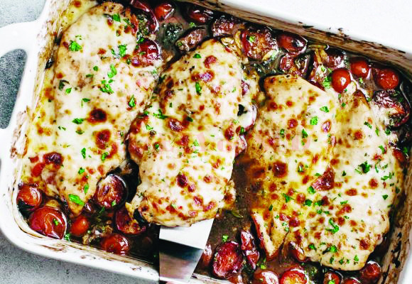 Într-o pungă resigilabilă amesteci bine puiul cu restul ingredientelor. Lași la marinat cel puțin 15 minute. Preîncălzești cuptorul la 220 °C. Într-o tavă, combini roșiile cherry cu restul ingredientelor, fără brânză. Aranjezi bucățile de piept de pui în centru. Dai la cuptor 18-20 de minute. Presari brânza rasă peste bucățile de carne și mai ții în cuptor până începe să se topească.