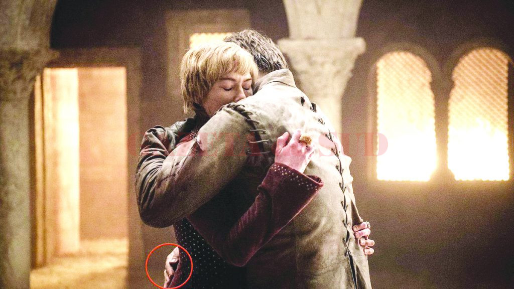 În fotografia incriminatoare, Jamie o îmbrățișează pe Cersei (Lena Headey), în Fortăreața Roșie, aflată în flăcări. Imaginea care a provocat isterie a fost ștearsă între timp și un reprezentant al HBO a declarat pentru New York Post că mâna dreaptă a lui Jamie nu apare la montaj, dar rețelele de socializare sunt pline de glume despre noua gafă. „Încă cercetăm“, au spus fanii, care propun, mai în glumă, mai în serios, inițierea unei petiții pentru refacerea sezonului 8 al popularului serial.