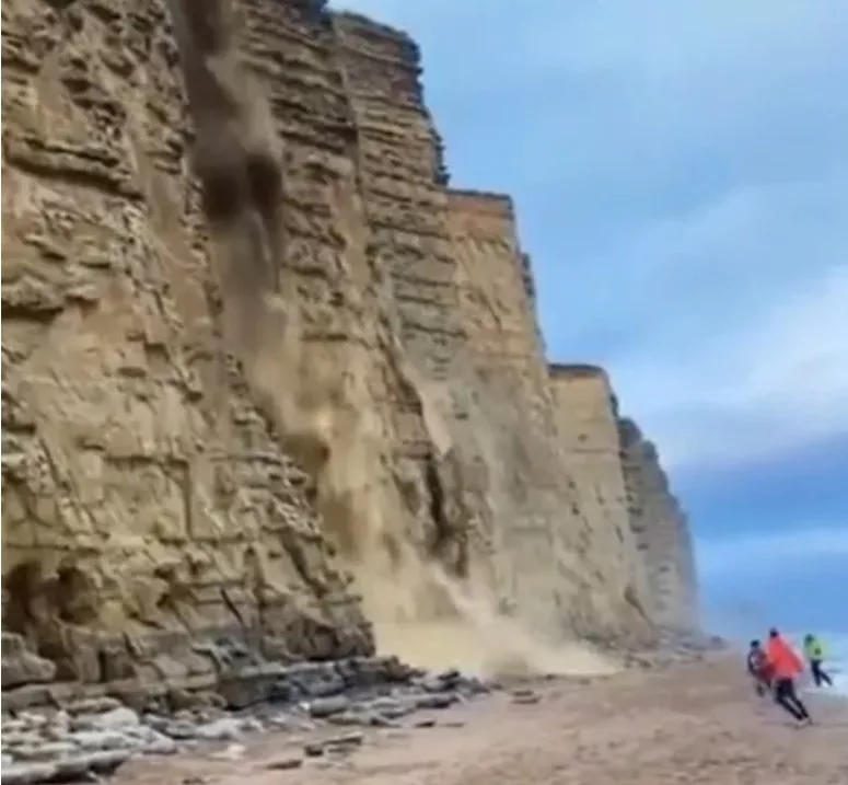 O bucată de stâncă de 150 de metri a fost surprinsă cum se prăbușește lângă un grup de turiști care aleargă pentru a-și salva viața. Incidentul a avut loc marți pe o plajă populară din Marea Britanie, însă imaginile au fost făcute publice joi.