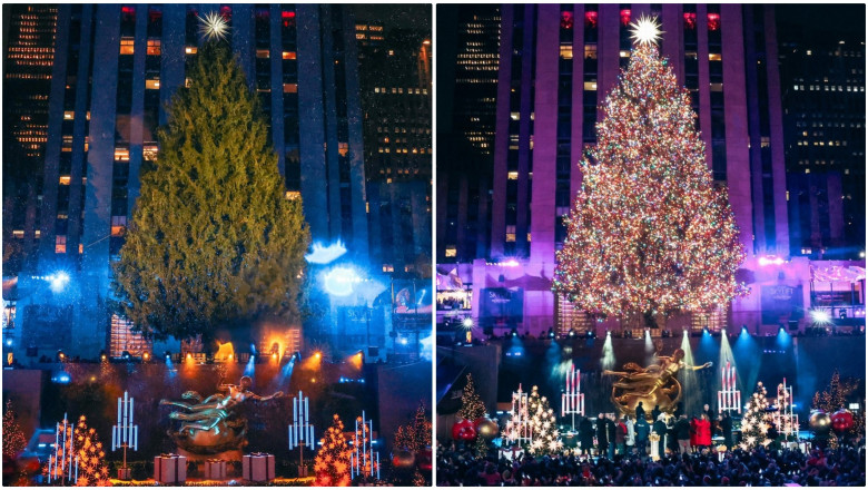 Zăpada a căzut uşor în New York City în timp ce bradul masiv a fost iluminat cu 50.000 de lumini multicolore şi a fost decorat cu o stea din cristal Swarovski. Bradul din acest an, un molid norvegian înalt de 23 de metri şi cu o circumferinţă de 13 metri, provine din West Stockbridge, Massachusetts. Cântăreşte aproximativ 11 tone şi are în jur de 70 de ani.