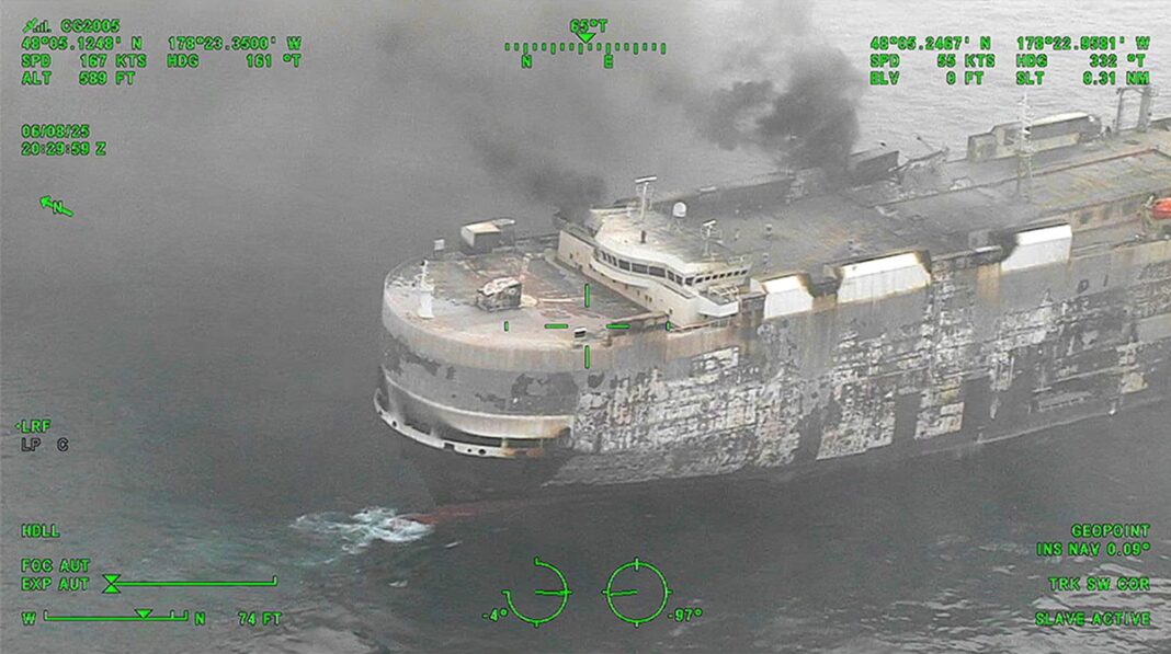 Arde de o săptămână! Nava Morning Midas, cu peste 3.000 maşini la bord, riscă scufundarea