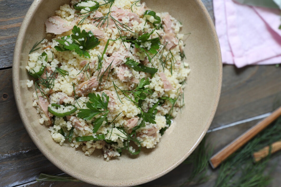 Ingrediente: 1 ceașcă cușcuș, 1 1/2 ceașcă apă, 1 lingură ulei, 1 conservă ton, 1 fir ceapă verde, 1/2 lămâie, sare, piper și verdeață (mărar și pătrunjel) după gust