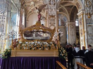Tradițiile pascale nu se opresc la procesiuni. În cofetăriile din oraș, ca celebra Pasticceria De Fraia, se pregătește spina santa – o prăjitură în formă de coroană de spini, cu dulceață de afine, creată pentru vizita Papei Ioan Paul al II-lea din 1993.