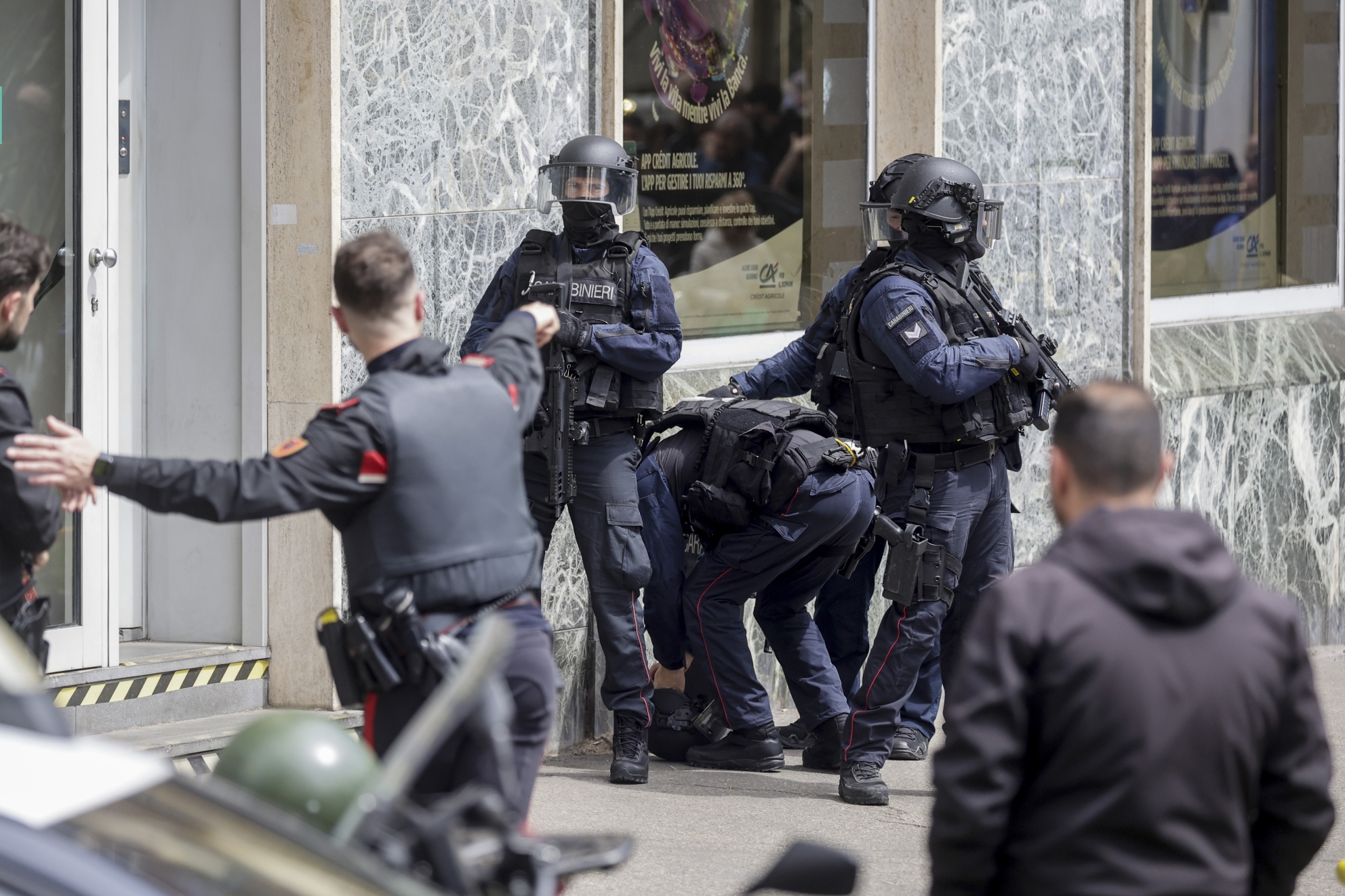 În scurt timp, zona a fost încercuită de carabinieri, care au confirmat că în interior se afla o bandă înarmată și zeci de ostatici, clienți și angajați ai sucursalei.