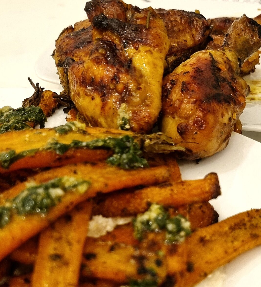 Spălăm şi curăţăm morcovii, apoi îi tăiem pe jumătate, pe lungime. Îi punem într-o tavă cu hârtie de copt şi îi condimentăm: 1 lingură de ulei, sare, piper. Punem tava la cuptor la 200 de grade pentru 30 de minute. Mărim temperatura la 250 de grade, pentru încă 10 minute.