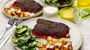 500 g cartofi; 75 ml ulei; sare; piper; usturoi granulat; oregano; ulei; 2 bucăți somon file; 150 g sfeclă roșie; 20 g mărar; 140 g iaurt grecesc; 20 g mărar; 15 g hrean; 20 g muștar; 5 g miere; 0,5 bucată zeamă de lămâie; 100 g salată mixtă.