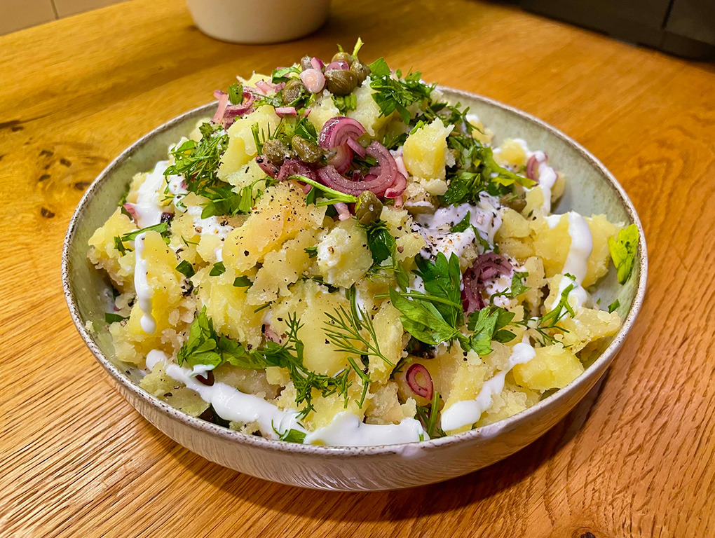 Salata e bună imediat, dar e mai sănătoasă rece, fiindcă cartoful prin răcire capătă calități prebiotice și are indicele glicemic mai mic.