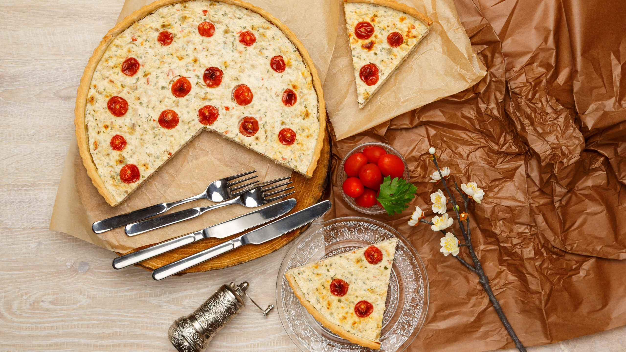 Toarnă umplutura în coaja de tartă, apoi distribuie roșiile cherry deasupra, din loc în loc.