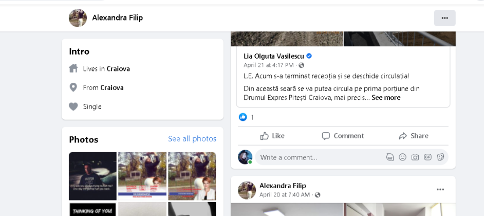 Am identificat aici mai multe elemente îndoielnice, trase la indigo. Imaginea de profil este una falsă, fie imaginea unui actor, fie o imagine de stock, fie imagini găsite pe internet la promovarea anumitor produse. Un alt element comun este că niciunul dintre conturi nu are alte fotografii personale, informaţii personale, iar conţinutul constă aproape exclusiv din distribuirea de postări despre realizările primăriei sau redistribuiri ale postărilor Olguţei Vasilescu. Am ataşat la finalul materialului rezultatele căutării după imagini şi capturi de ecran edificatoare.