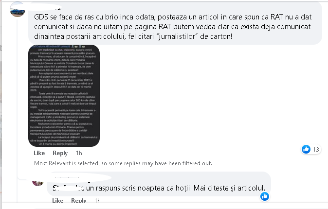Miercuri seara, pe 8 martie, în jurul aceleiași ore, 22:00, RAT Craiova anunța pe pagina de Facebook când vor începe să circule noile tramvaie. Pentru data de joi, 9 martie, un jurnalist GdS pregătise un material chiar despre acest subiect (vezi aici: Tramvaiele noi din Craiova întârzie să apară pe şine). Ba mai mult, jurnalistul făcuse solicitare conform legii 544/2001 către regia din subordinea Primăriei încă de luni, 6 martie, în care întreba când se vor putea bucura craiovenii de ele. RAT nu și-a găsit timpul să răspundă la solicitarea presei, dar cu câteva ore înainte de apariția articolului (și după ce ediția PDF fusese transmisă abonaților), „coincidența” a făcut ca RAT să facă anunțul pe Facebook, anunț care avea zeci de distribuiri la prima oră a dimineții.