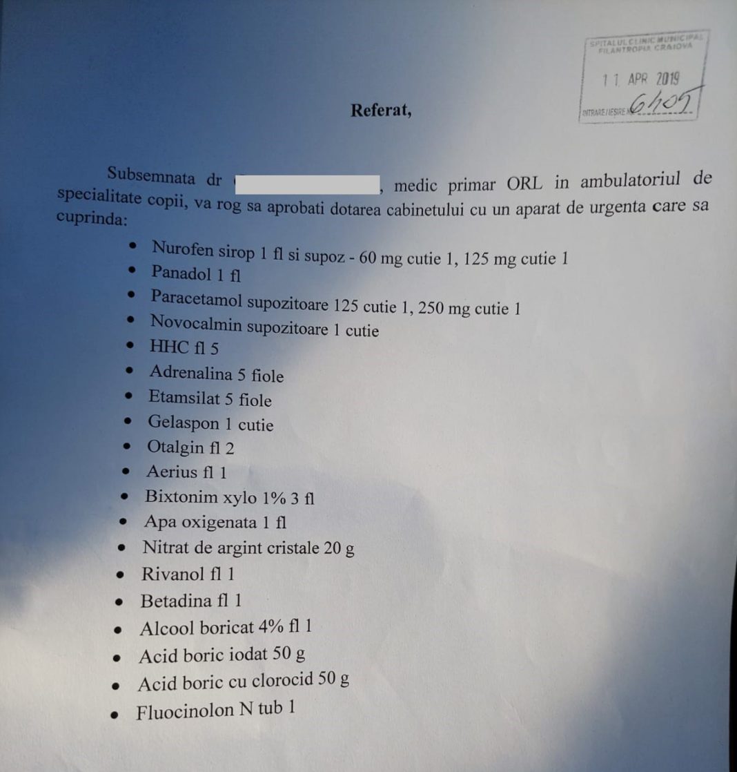 Am întrebat managerul spitalului despre această situație, iar acesta a spus, ezitant, că, „toate ambulatoriile și spitalele ar trebui să aibă aparat de urgență. În momentul de față, eu știu că există aparat de urgență, la momentul acela nu știu ce s-a întâmplat. O să mă interesez. Acest lucru cade în sarcina fiecărui medic din cabinetul respectiv, eu nu am necesare pe care să nu le onorez din punct de vedere al achizițiilor”. Cu toate astea, GdS a intrat în posesia unor referate prin care se solicită dotarea cabinetului ORL din cadrul ambulatoriului de copii de la Filantropia acest aparat de urgență, cu toate substanțele și medicamentele precizate. Unul dintre referate este făcut în luna aprilie, anul 2019, iar altul în luna aprilie a acestui an.