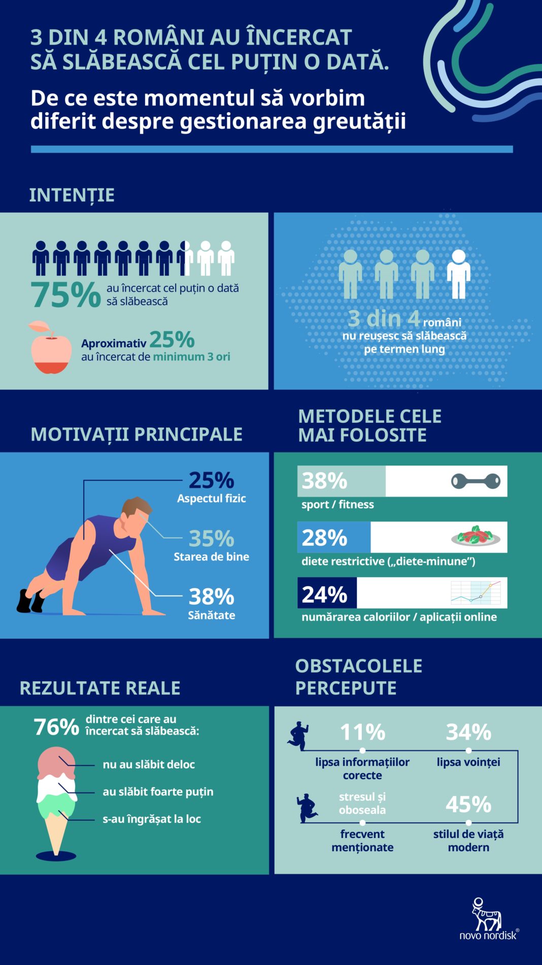 Un studiu european realizat în cinci țări, la inițiativa Novo Nordisk, arată că 43% dintre respondenți nu știu că OMS clasifică obezitatea drept o boală cronică complexă. Lipsa de informare contribuie la stigmatizare și la așteptări nerealiste legate de slăbit.