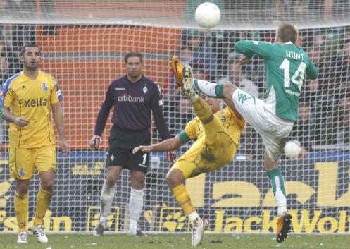 MSV Duisburg, echipa din Bundesliga cu cei mai mulţi români, Claudiu Niculescu, Mihai Tararache şi Iulian Filipescu, a reuşit o victorie de senzaţie în etapa a 26-a a Bundesligii. Alb-albaştrii lui Rudi Bommer, aflaţi mai mereu în coada clasamentului în acest sezon, s-au impus cu scorul de 2-1 pe terenul lui Werder Bremen, formaţie care vizează un loc de Liga Campionilor. Duisburg a controlat prima repriză, iar jucătorii liniei codaşe din Bundesliga au redus la tăcere un stadion întreg. Oaspeţii au deschis scorul în minutul 32, când bosniacul Ivica Grlic nu l-a mai lăsat pe Niculescu să execute o lovitură liberă de la 20 de metri şi a reuşit un gol spectaculos. Bremen, o echipă celebră şi pentru faptul că de multe ori reuşeşte să întoarcă rezultatul atunci când este în dezavantaj, nu şi-a revenit nici după ce a primit gol, iar Ishiaku a majorat diferenţa de pe tabelă în minutul 42, profitând de marcajul lejer al fundaşului Nado.