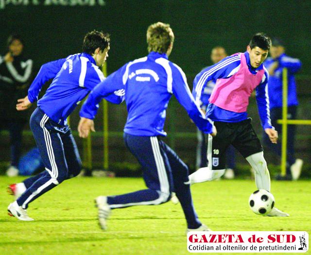 Ieri, oltenii au efectuat două şedinţe de pregătire, prima cu caracter fizic, iar cea de-a doua, de după-amiază, cu mingea.