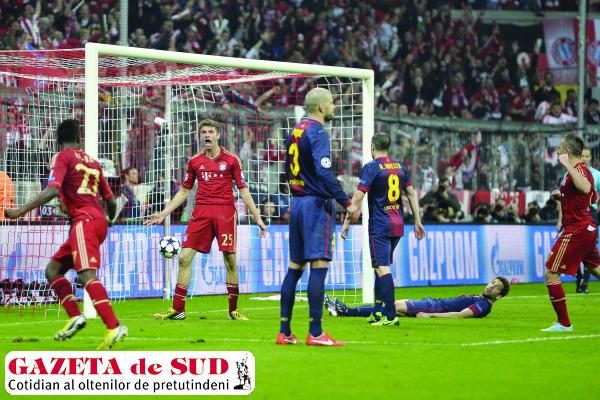 Formaţia Bayern München a învins, marţi seară, pe teren propriu, cu scorul de 4-0 (1-0), pe FC Barcelona, într-un meci contând pentru prima manşă a semifinalelor Ligii Campionilor. Golurile au fost marcate de Thomas Muller (‘25, ‘82), Mario Gomez (‘49) şi Arjen Robben (‘73).