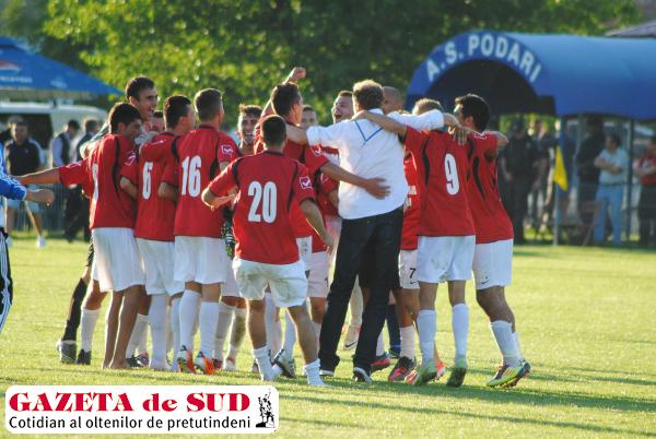 AS Podari s-a impus ieri seară, pe teren propriu, în faţa echipei Dunărea Calafat, scor 4-2, în ultima etapă din play-off-ul campionatului judeţean. În urma acestui succes AS Podari a urcat pe primul loc în clasament, devenind noua campioană a Doljului. Golurile învingătorilor au fost marcate de Ţenovici (’16, ’55-penalti), Stoica (’88) şi Preda (’90+3), replica oaspeţilor venind de la Uşurelu (’48) şi Pişleag (’82-penalti).