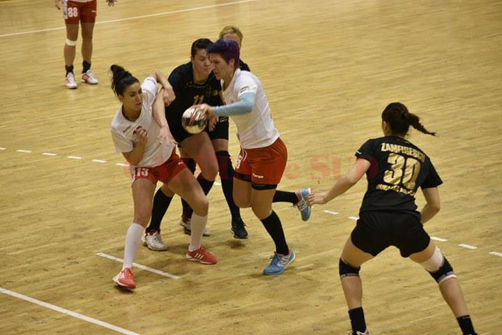Mihaela Ani Senocico (la minge) şi colegele sale au învis Brăila la şase goluri diferenţă (foto: Facebook HCM Râmnicu Vâlcea))
