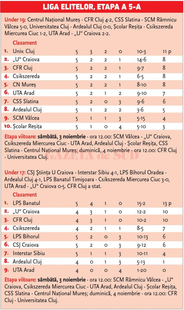 În urma acestui succes, Universitatea Craiova Under 17 ocupă locul secund, cu 10 puncte, la trei distanţă de liderul LPS Banatul Timişoara. În etapa viitoare, elevii lui Nelu Petrişor vor evolua tot în deplasare, pe terenul celor de Interstar Sibiu, disputa fiind programată sâmbătă, 3 noiembrie, de la ora 14.00.