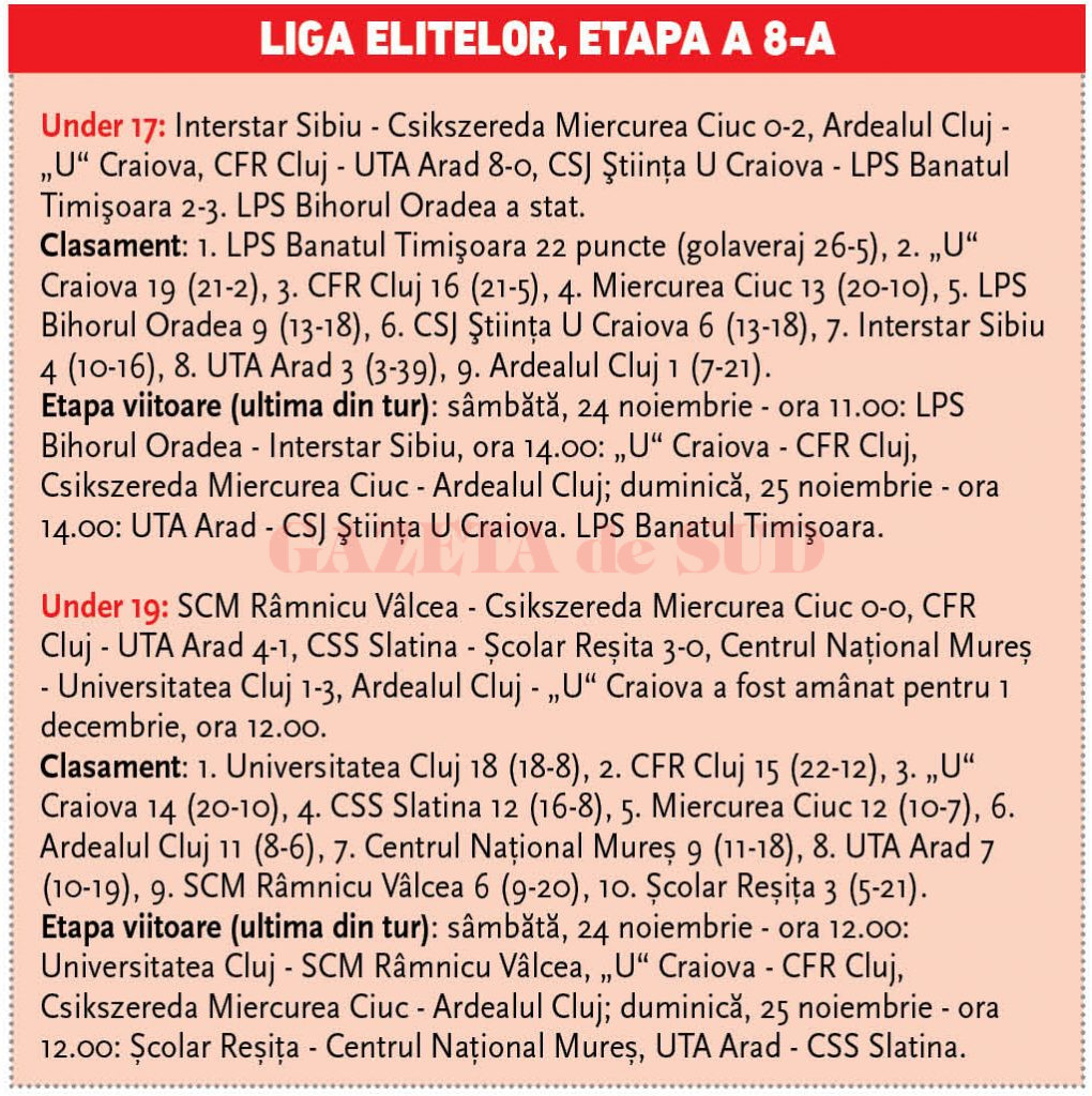 Cealaltă reprezentantă a Doljului la Liga Elitelor U17, CSJ Ştiinţa U Craiova, a pierdut, scor 2-3, întâlnirea de pe stadionul „Aripile“, susţinută în compania liderului LPS Banatul Timişoara. Pentru olteni au marcat Alex Mitru şi Sergiu Ricman.