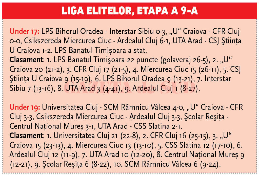 La Under 19, Universitatea Craiova U19 a reuşit să marcheze de trei în poarta lui CFR Cluj, dar a trebuit să se mulţumească doar cu un punct. A fost 3-3 pe „Aripile“, iar golurile alb-albaştrilor au fost marcate de Luis Niţu (2) şi Alex Vulpe.