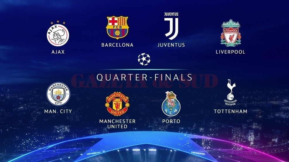În sferturile Ligii Campionilor s-au calificat următoarele echipe: Manchester United, Tottenham Hotspur, Manchester City, Liverpool, FC Barcelona, Juventus Torino, Ajax Amsterdam şi FC Porto. Tragerea la sorţi a meciurilor din sferturile de finală va avea loc mâine, de la ora 13.00. În cadrul aceleiaşi ceremonii se vor stabili şi partidele din semifinale. În ambele faze, nu există restricţii de ţară sau capi de serie.