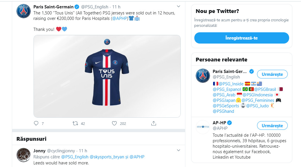 Tricourile, disponibile la preţul de 175 de euro fiecare, la magazinul online al clubului francez, şi-au găsit toate cumpărători „în mai puţin de 12 ore“, a indicat clubul parizian, citat de Agerpres.