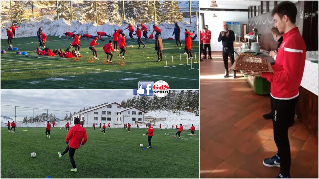 Formația CSM Slatina își vede de treabă în cantonamentul de la Cheile Grădiște – Fundata. Greul este departe de a fi trecut, dar, din fericire, în tabăra olteană se mai strecoară și câte un moment „dulce“. Dacă miercuri a fost ziua de naștere a lui Vlad Motroc, astăzi i-a venit rândul lui Dorin Toma să fie în centrul atenției. Mijlocașul grupării de pe malul Oltului a ajuns la borna 22, motiv pentru care colegii și membrii staff-ului tehnic i-au cântat „La mulți ani!“ și s-au bucurat de tortul său.