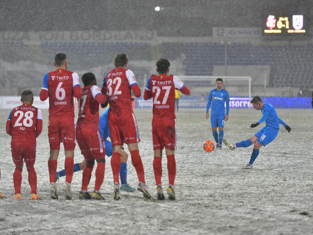 Universitatea Craiova a început foarte bine și a deschis scorul prin Cicâldău, care a tranformat cu precizie penaltiul obținut de Ivan. Alb-albaștrii au etalat un joc bun de așteptare. I-a fost mult mai ușor să apere avantajul de pe tabelă pe terenul acoperit cu zăpadă, în timp ce moldovenii au atacat haotic.