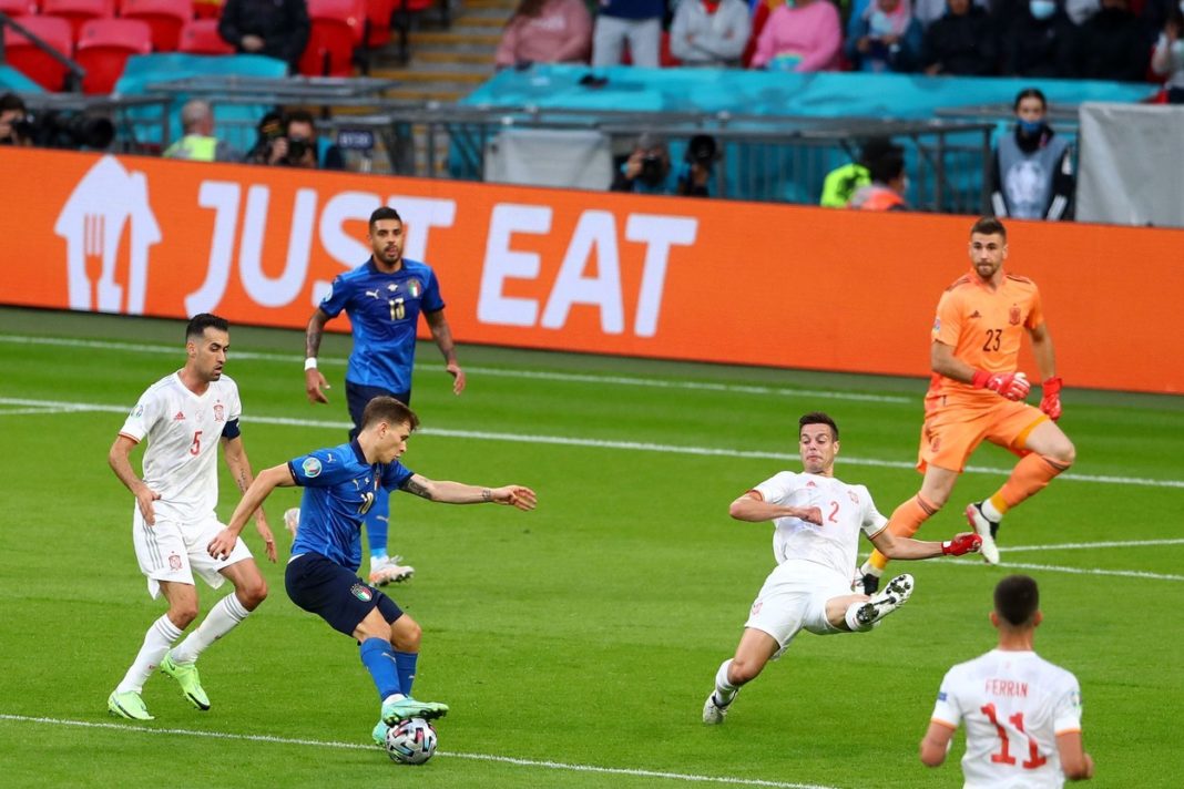 Meciul, per total, a fost dominat de spanioli, în special la capitolul posesie. Ibericii au fost mai periculoși în prima parte, dar nu au modificat tabela. La reluare, Italia a început să atace și să rateze ocazii importante prin Chiesa și Insigne. Într-un final, pe un contraatac, „Squadra Azzurra“ a deschis scorul prin Frederico Chiesa, în minutul 60, cu un șut plasat de la marginea careului de 16 metri. Spania a năpustit, apoi, spre poarta lui Donnarumma, iar după ratările lui Olmo și Busquets, a venit și golul egalizator. Alvaro Morata și-a „spălat“ toate greșelile de la acest European și a trimis meciul în prelungiri cu reușita sa din minutul 80.
