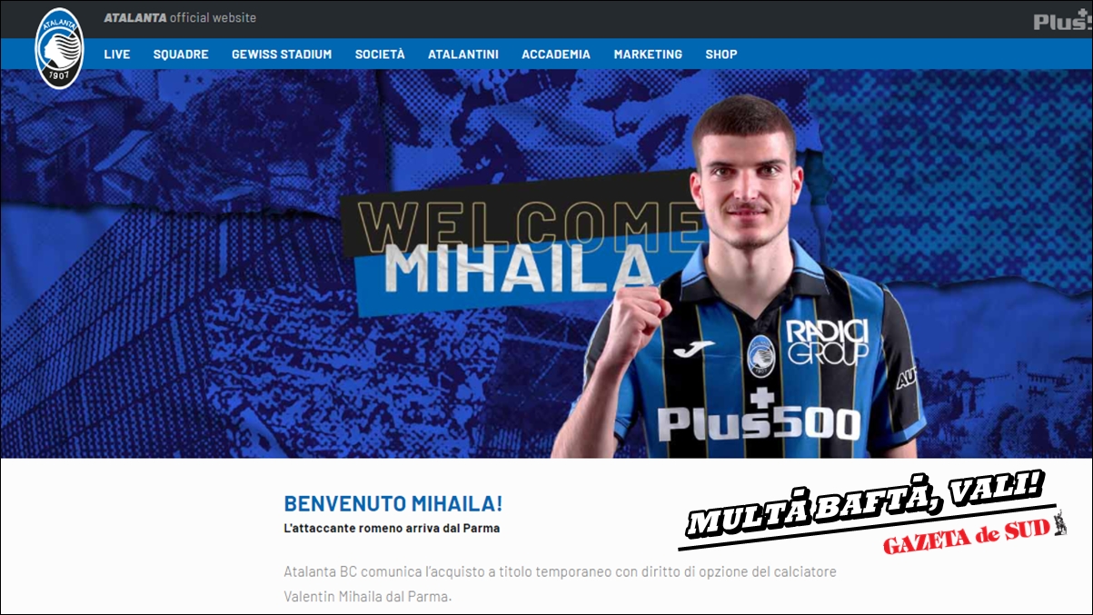 „Atalanta BC a anunță achiziționarea temporară, cu opțiune de transfer, a mijlocașului Valentin Mihăilă de la Parma. Născut la 2 februarie 2000, Valentin este considerat unul dintre cei mai interesanți tineri jucători români, un fotbalist ofensiv rapid și tehnic, capabil să ocupe mai multe poziții în zona ofensivă.