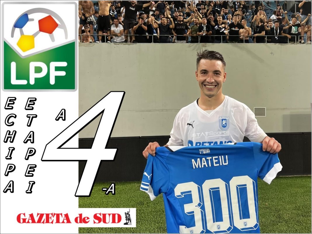 Liga Profesionistă de Fotbal (LPF) a anunţat astăzi echipa etapei a 4-a din Superligă. Chiar dacă derbiul Băniei nu a fost spectaculos, reprezentanţii forului l-au remarcat pe Alexandru Mateiu, mijlocaşul Universităţii Craiova. Pentru Mateiu, meciul cu FCU, a avut şi o altă mare însemnătate, fiind disputa cu numărul 300 pe prima scenă.