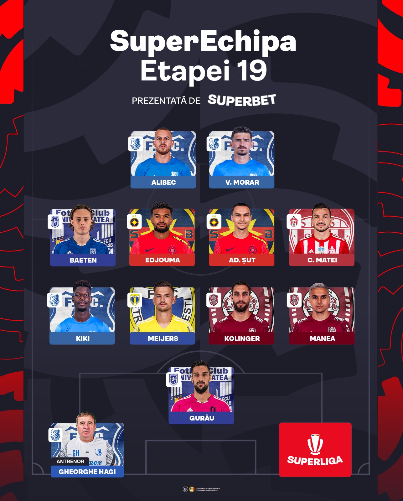 Liga Profesionistă de Fotbal (LPF) a anunţat astăzi echipa etapei a 19-a din Superligă. Cum FCU Craiova a triumfat pe terenul rivalei Universitatea Craiova, doi dintre jucătorii care au excelat au fost incluşi în cel mai bun unsprezece.