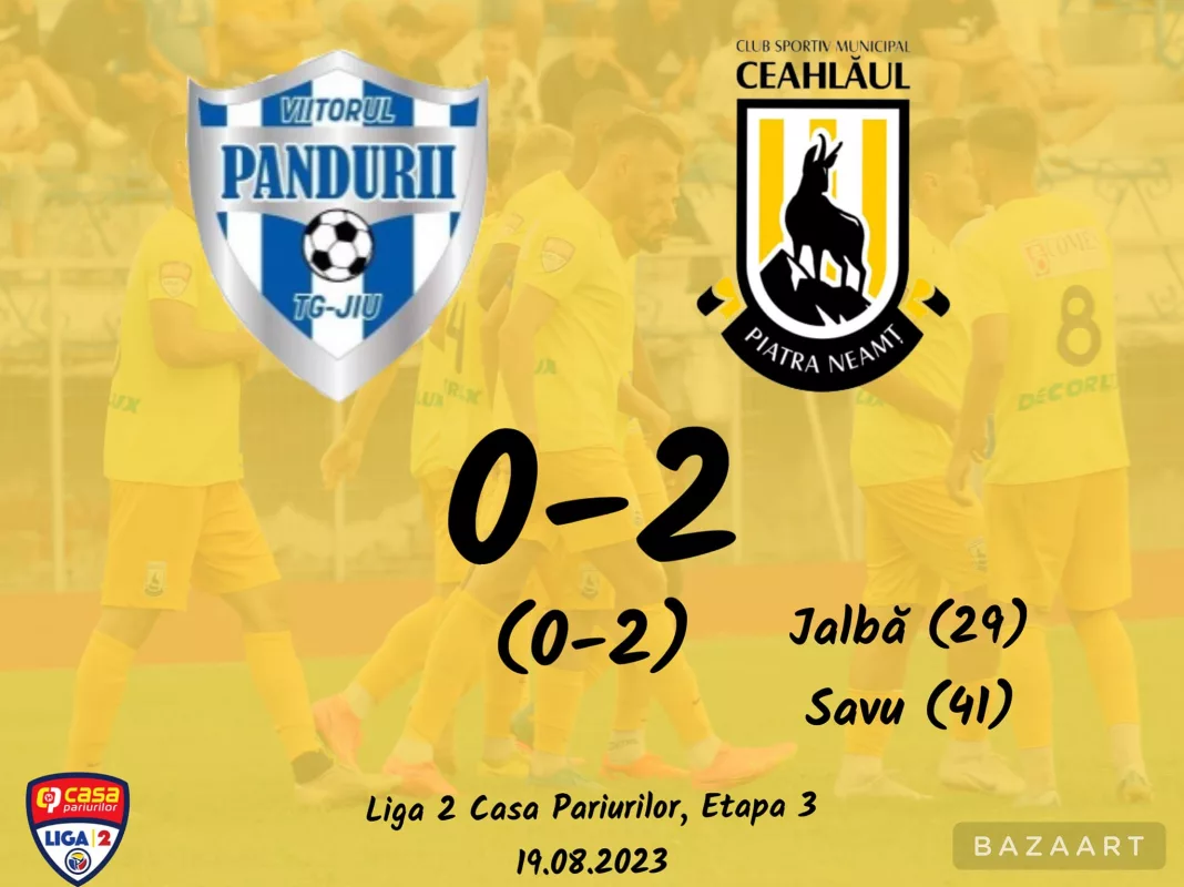 Viitorul Pandurii Târgu Jiu a cedat clar, cu 2-0, în partida susţinută sâmbătă, pe stadionul „Municipal“, în faţa Ceahlăului Piatra Neamţ. Moldovenii au marcat prin Cristin Jalba (’29) şi Marius Savu (’41). Partida a contat pentru etapa a 3-a din Liga 2.