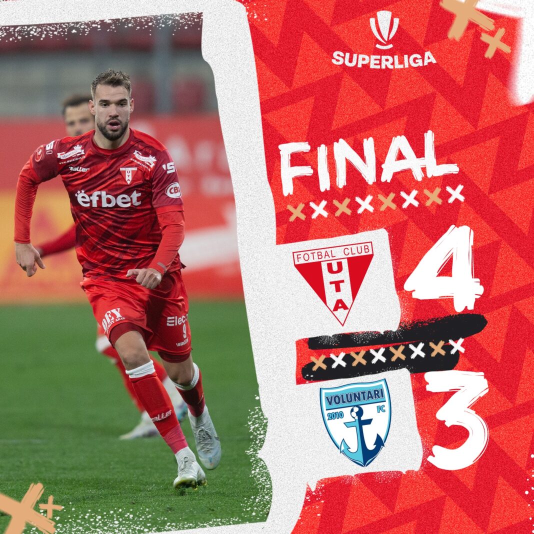 UTA Arad a trăit periculos în meciul susținut luni seară, pe stadionul „Francisc Neuman“, în compania echipei FC Voluntari. Gazdele s-au impus greu, cu 4-3, la capătul unui meci în care a fost condusă de două ori și a dat lovitura de grație în minutul 90+6.