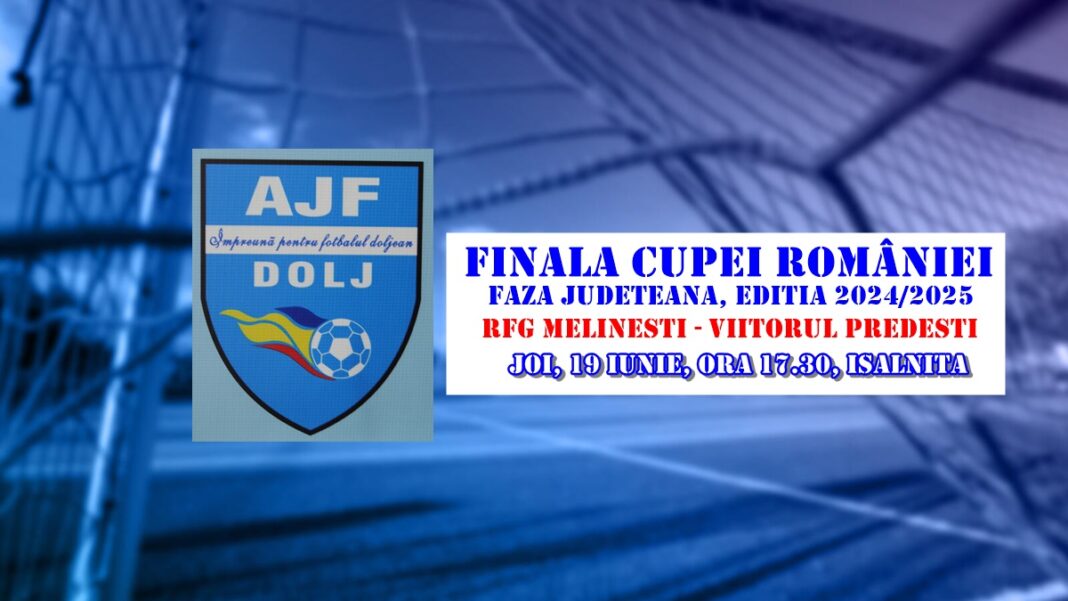 Fotbalul doljean propune joi, 19 iunie, de la ora 17.30, pe stadionul „Comunal“ din Isalnita, finala Cupei Romaniei – faza județeană, ediția 2024-2025. Oponente vor fi ACS RFG Melinești si ACS Viitorul Predesti.