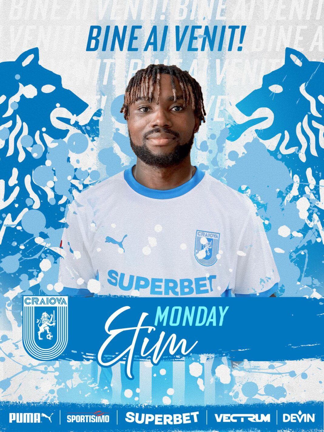 Bun venit la Știința, Monday Etim! Universitatea Craiova își întărește compartimentul ofensiv și l-a transferat astăzi pe Monday Etim, de la formația Hillerod. Nigerianul în vârstă de 26 de ani a semnat cu Știința un contract valabil pe o perioadă de 3 ani, cu opțiune de prelungire pentru încă un an. Noul nostru leu a evoluat în trecut la echipe precum Hillerod, Roskilde, Helsingor, Orange County și FC Toros. Succes în familia alb-albastră!”, au scris oltenii pe Facebook.