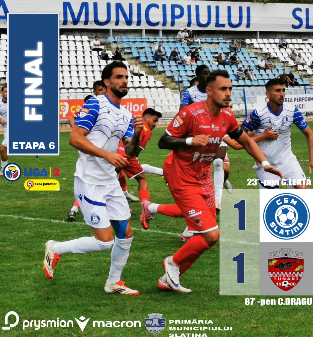 CSM Slatina se tot afundă în subsolul clasamentului de la Liga 2, având doar trei puncte în şase etape. Echipa lui Claudiu Niculescu a „reuşit“ să o comită iarăşi pe teren prorpiu, remizând, 1-1, cu CS Tunari. Oltenii au deschis scorul în meciul de sâmbătă, de pe stadionul „1 Mai“, prin George Leaţă (’23 – penalti). Tot de la punctul cu var au înscris şi oaspeţii, autor fiind Claudiu Dragu (’87).