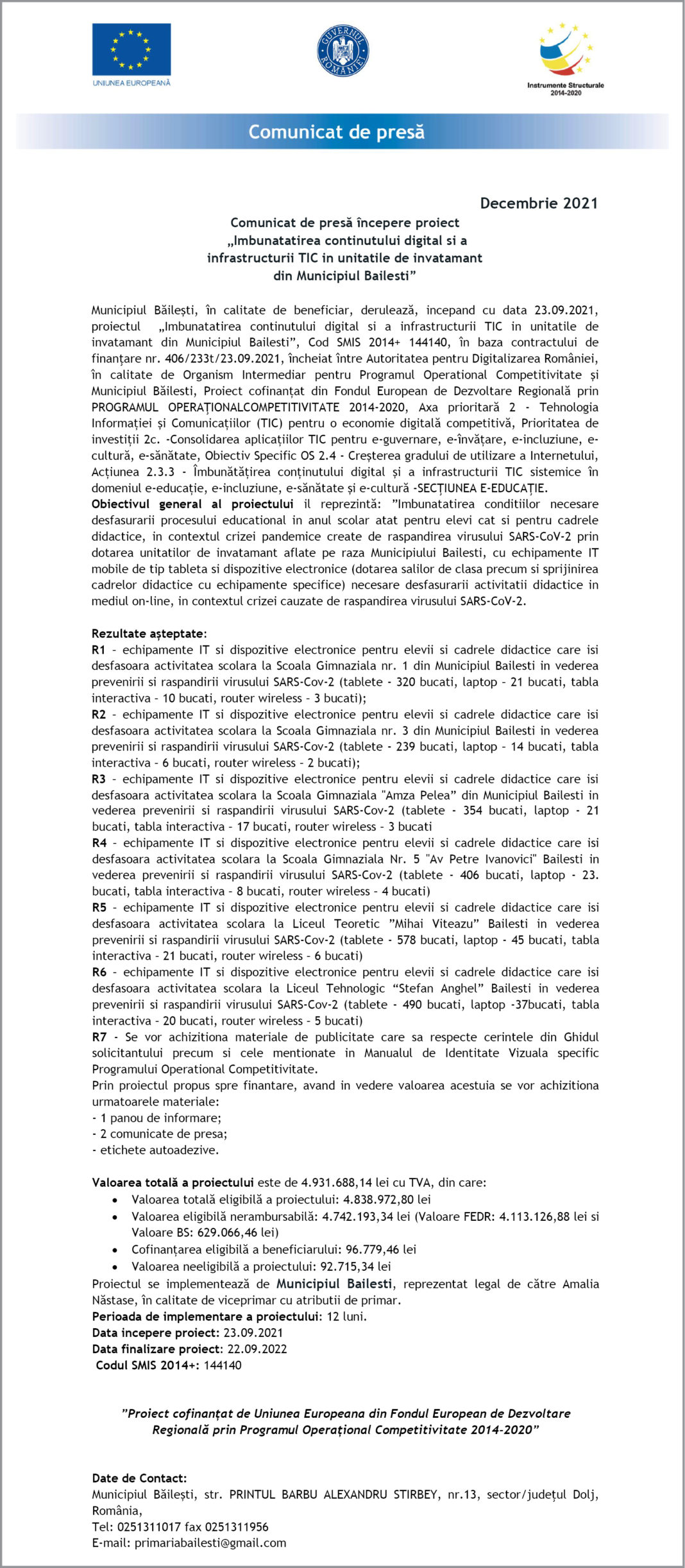 Comunicat de presă începere proiect „Îmbunătățirea conținutului digital și a infrastructurii TIC în unitățile de învățământ din Municipiul Băilești”