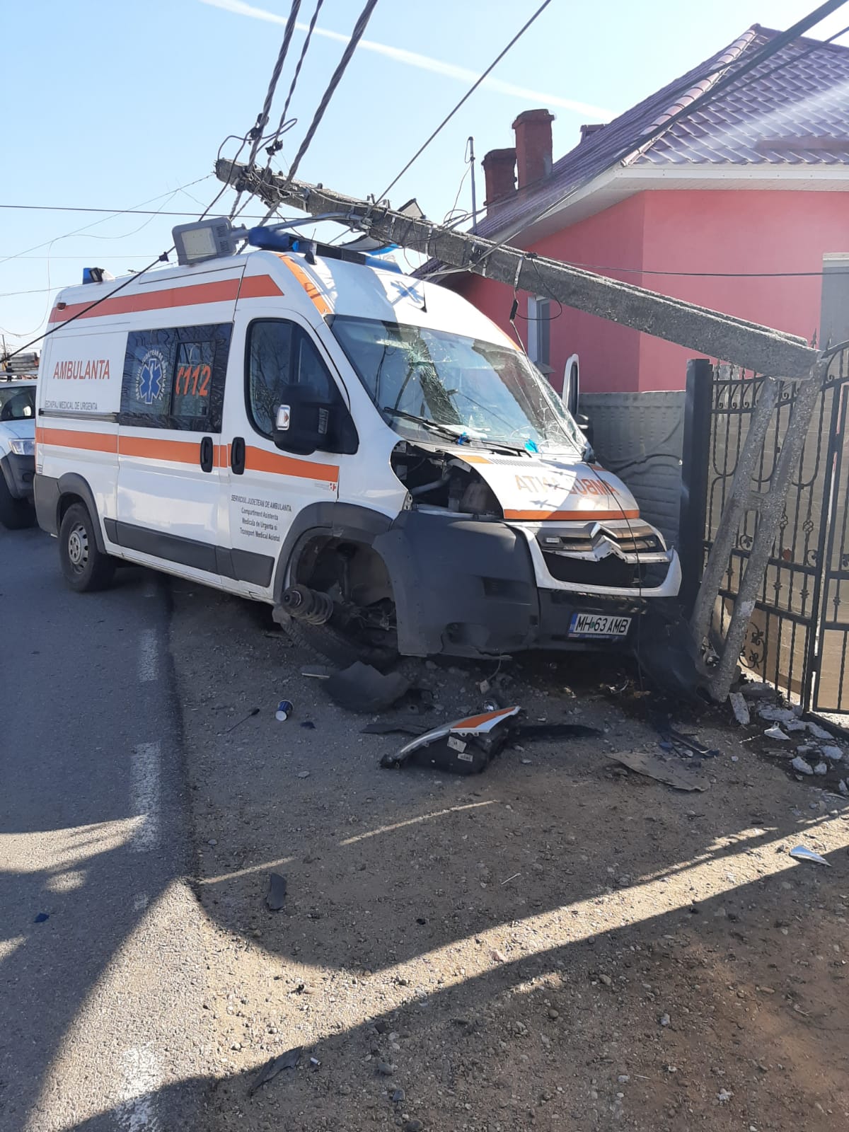 O ambulanţă a ajuns într-un stâlp de electricitate din pricina unui şofer imprudent, care nu s-a asigurat la efectuarea virajului.