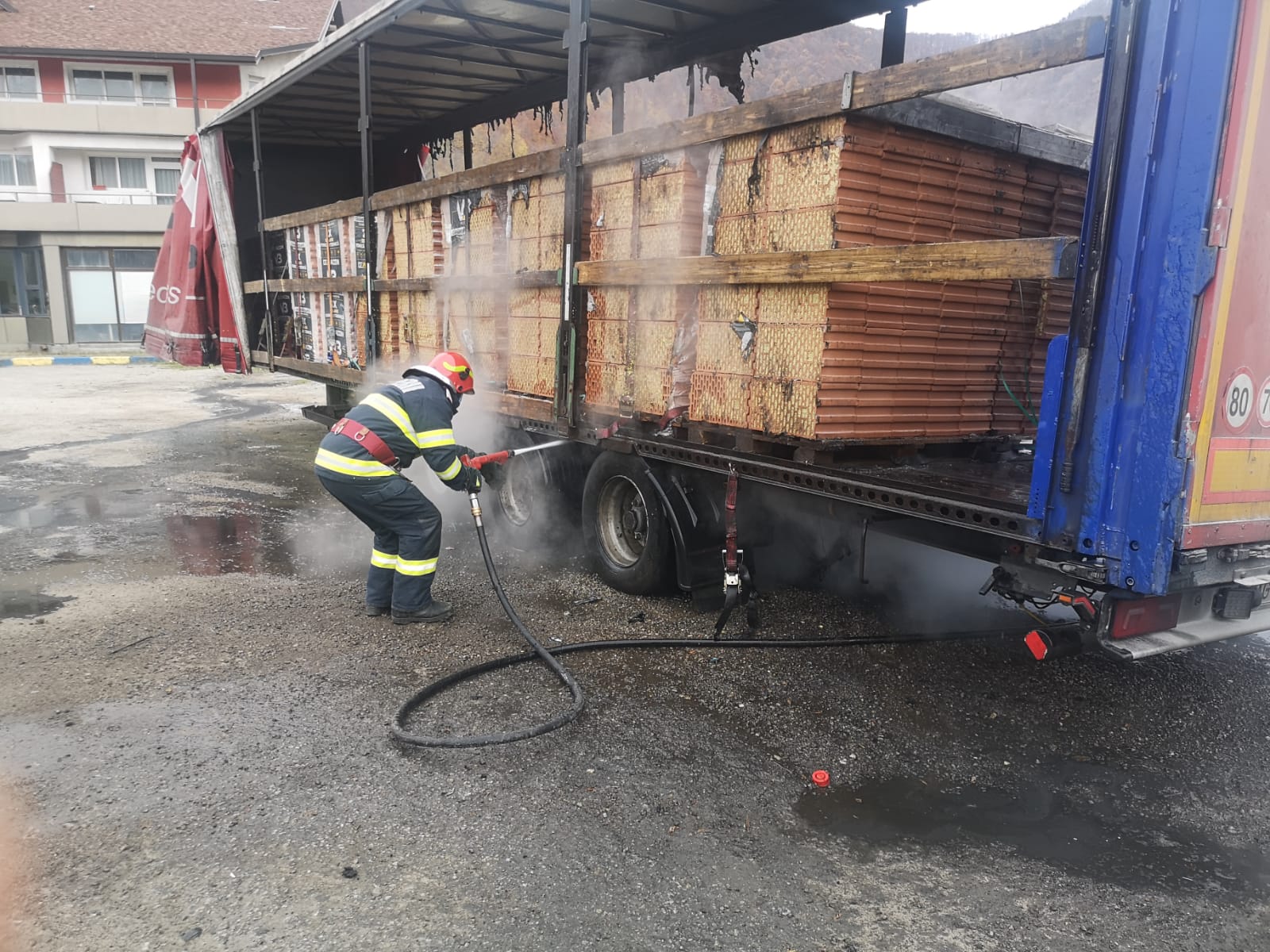 Un incendiu puternic a izbucnit, pe D.N. 7, la km 222, pe raza comunei Racovița, la semiremorca unui tir, încărcată cu cărămidă.