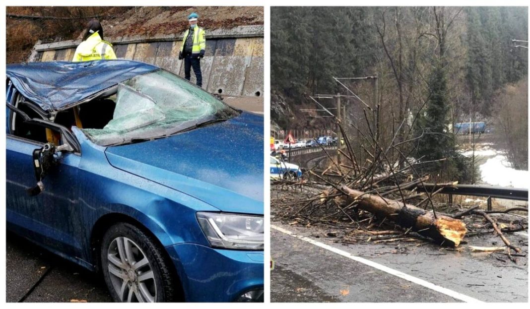 La un moment dat, de pe versantul din partea stângă a direcţiei de mers s-a rupt un arbore care a căzut peste mașina condusă de soţul femeii.