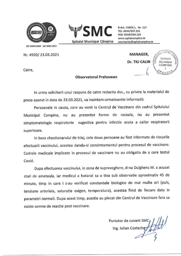 Ei au avut simptome de COVID-19 înainte de imunizarea care a avut loc la Spitalul Municipal Câmpina. Cei doi au crezut că sunt răciţi şi au luat tratament pentru răceală. Fiica lor este în stare gravă la secţia de Terapie Intensivă.