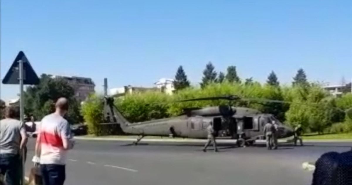 (VIDEO) Un elicopter militar american a aterizat forțat într-un sens giratoriu din București