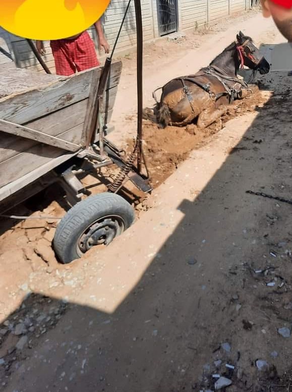 Localnicii spun că firma care lucrează în zonă a săpat șanțurile, a introdus conducta, dar nu a tasat pământul. Din această cauză, calul unui locuitor de pe Aleea I Drumul Apelor a fost înghițit de pământ. În urma ploii căzute zilele trecute, pământul s-a înmuiat. Prin urmare, când calul a trecut pe aleea cu pricina, pământul i-a fugit de sub picioare și a picat în șanț. Odată cu calul s-a prăbușit și căruța la care animalul era înhămat.