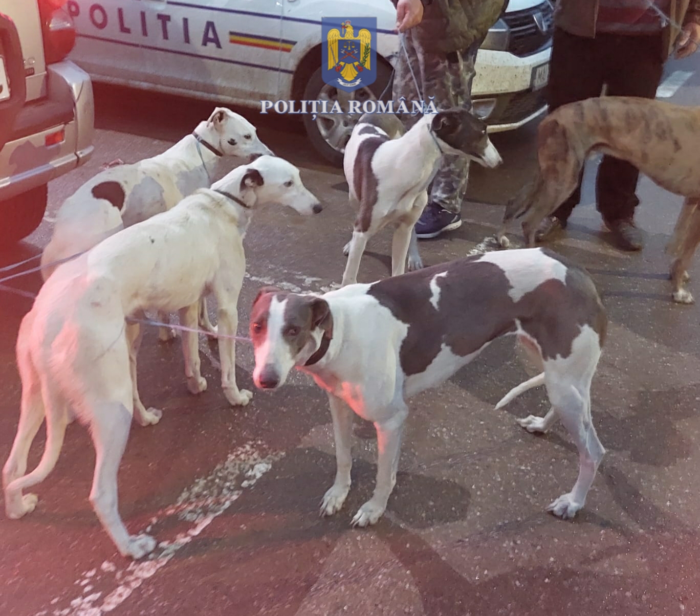 În urma controlului autoturismului au fost găsiţi cinci câini din rasa ogar, o lanternă tip proiector şi mai multe obiecte din fier destinate a înţepa cauciucurile autoturismelor”, au precizat polițiștii doljeni.