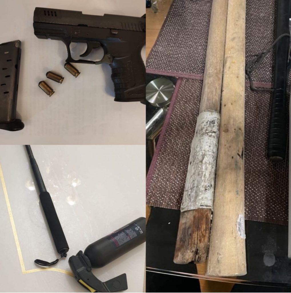 În dimineţa zilei de marţi, poliţiştii au descins la domiciliile suspecţilor din Craiova şi comuna Şimnicu de Sus. Au fost ridicate spray-uri lacrimogene, un baston telescopic, 10 cartușe, o bâtă de baseball, un briceag, un baston de cauciuc şi două bâte din lemn. De asemenea, poliţiştii au descoperit un pistol neletal şi 3 cartușe, pentru care nu au putut fi prezentate documente de provenienţă.